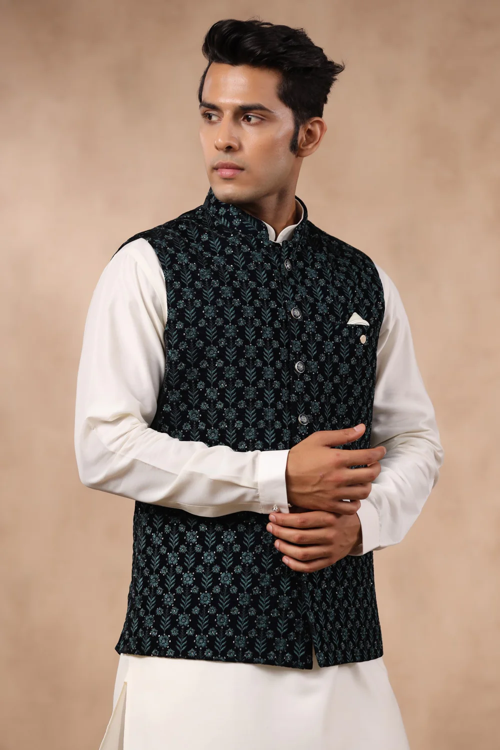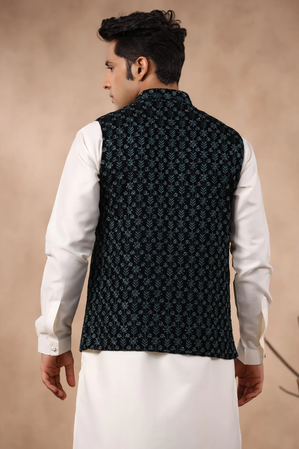Men’s Rama Green Coloured Velvet Fabric Dual tone Embroidered Crafted with Sequin Work Party Wear Regular Fit Waist Coat Perfectly Suitable for Sangeet, Haldi, Mehandi, Engagement & Other Occasions